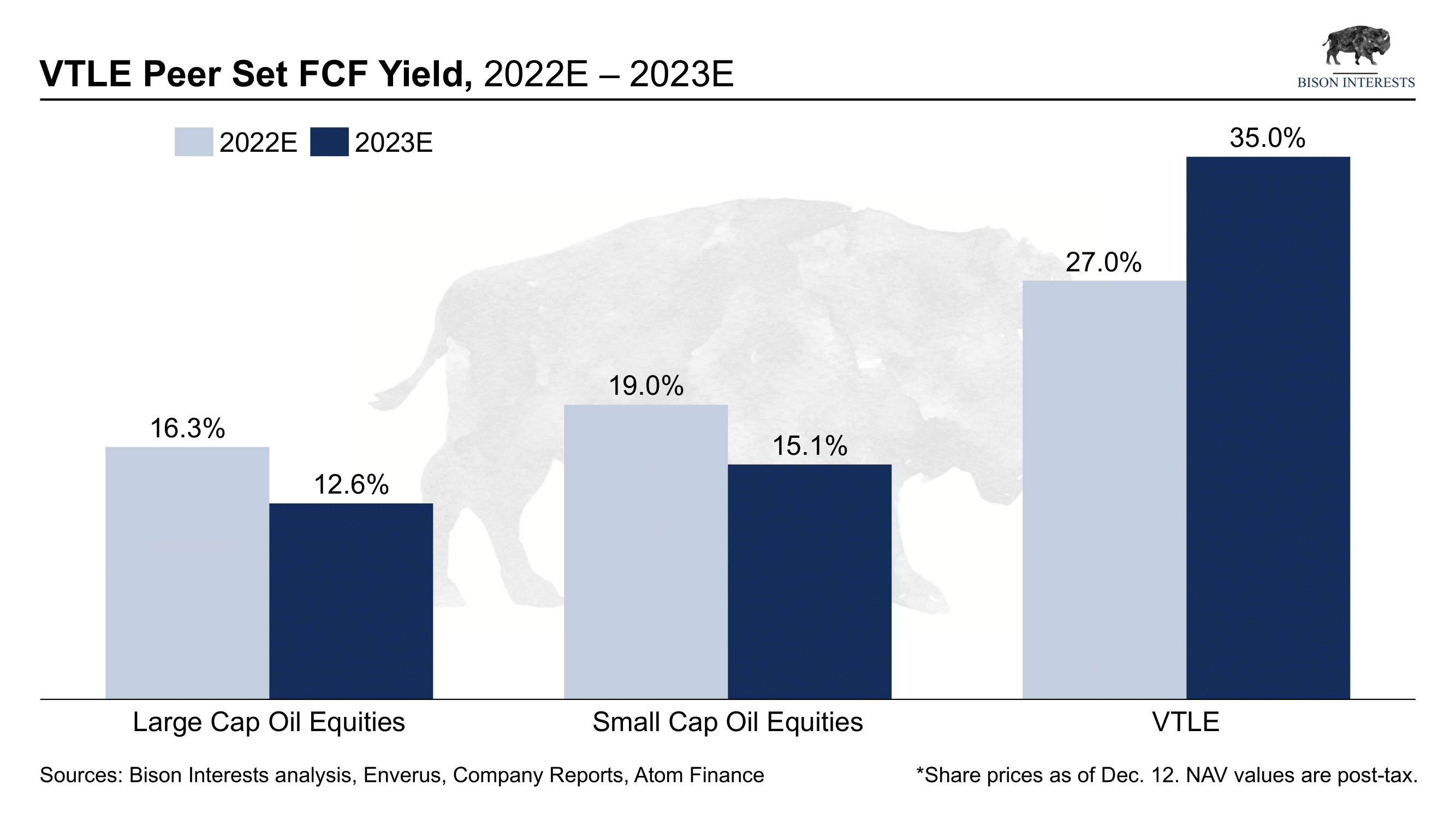 Despite smaller, lower quality inventory, VTLE’s free cash flow yield is projected to increase materially in 2023 as Vital actively buys back shares and retires debt, while both large and small cap peers are projected to become more expensive in consensus estimates. VTLE may have ~130% upside if its free cash flow yield were to trade in line with peers: