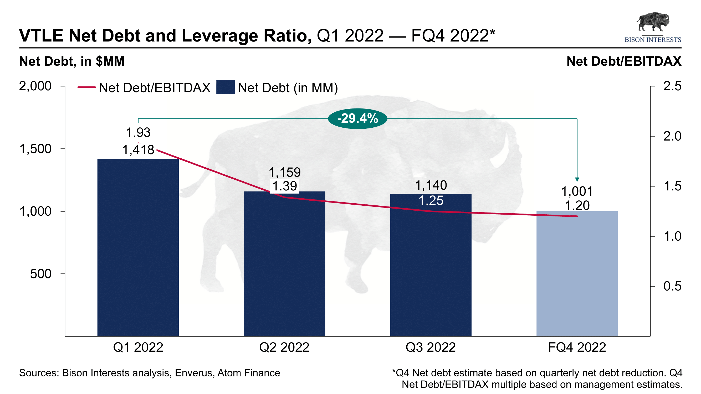 Vital’s liquidity has increased from $550MM to $955MM between February and December of last year, and we estimate Vital reduced net debt and leverage by ~30% and ~40%, respectively, in 2022: