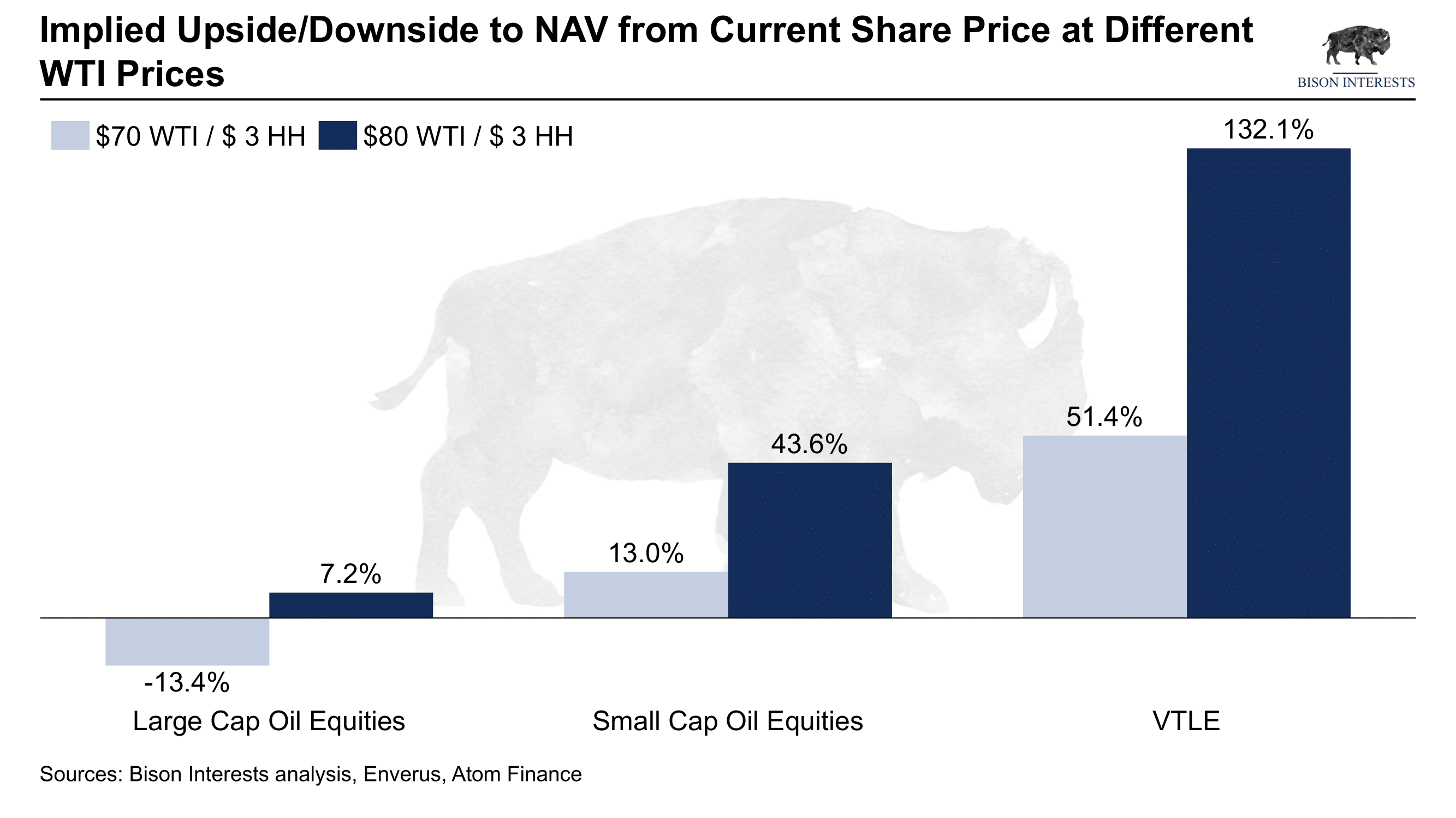 Small cap oil and gas equities are trading at a steeper discount to large caps, and once again, VTLE’s valuation is at the low end of the pack. VTLE may have ~130% upside if it were to trade in line with its net asset value at $80 WTI and $3 HH, which are roughly in line with current commodity prices: