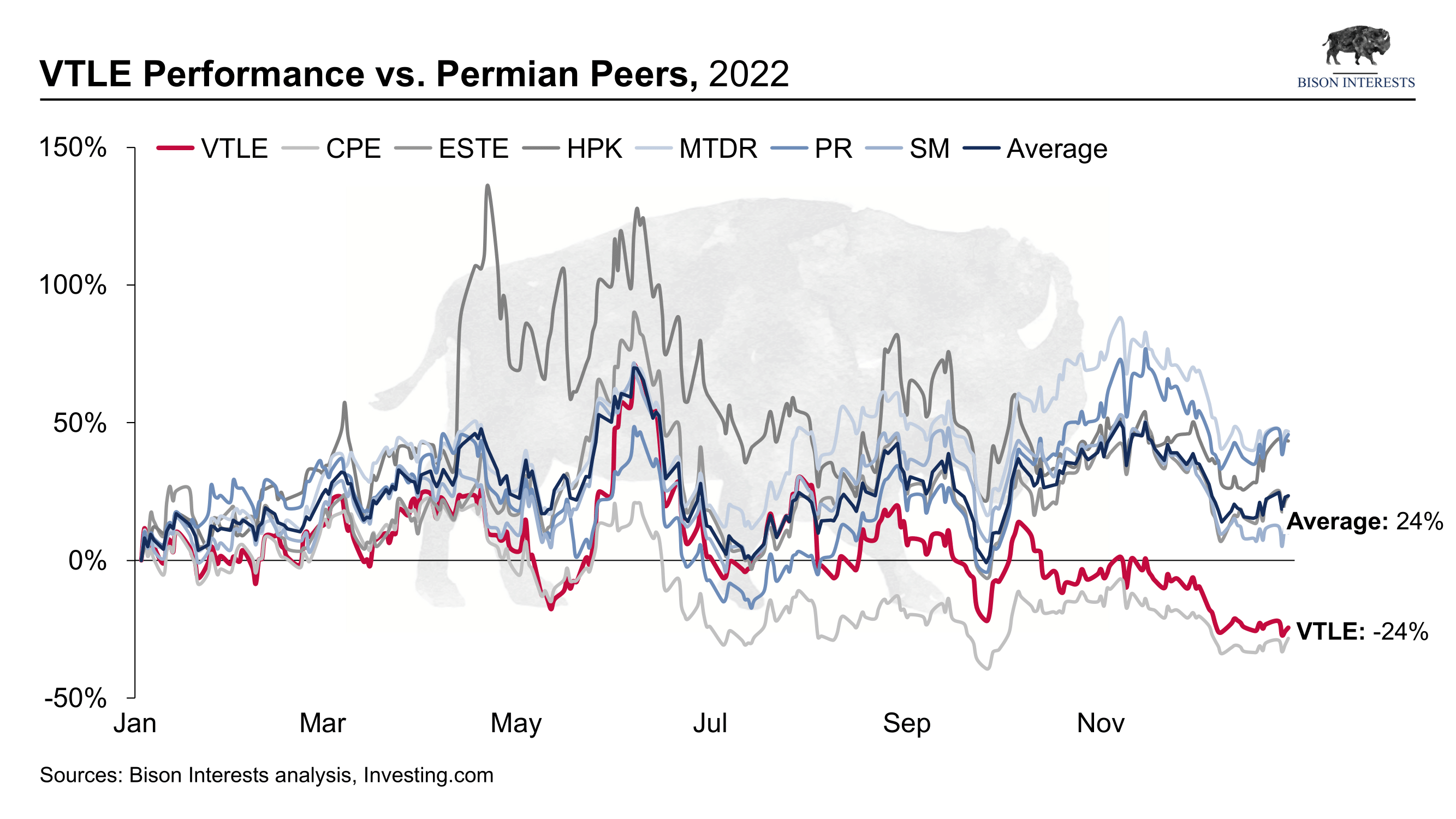 The most likely driver of Vital’s underperformance is a series of production misses and subsequent lower production guidance in Q3 2022. Management had originally forecasted 39,500 - 42,500 bbl/d of oil production in 2022, but due to operational headwinds in the North Howard County and unforeseen (by management) cost inflation, production was lower than guidance throughout most of the year. Management was subsequently forced to lower its full year production guidance, and VTLE’s underperformance gap to peers began to widen.